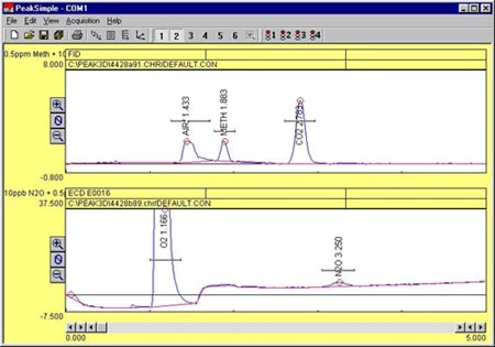 The Greenhouse Gas GC is designed for the detection of carbon dioxide (CO2), methane (CH4) and nitrous oxide (N2O). Depending upon the volume of the sample loop on the gas sampling valve, it can detect trace levels or high concentrations. It may be used for stack or ambient air monitoring, or in a plane for atmospheric air analysis. The chromatogram below was generated by a Greenhouse Gas GC with a 5mL sample loop. |